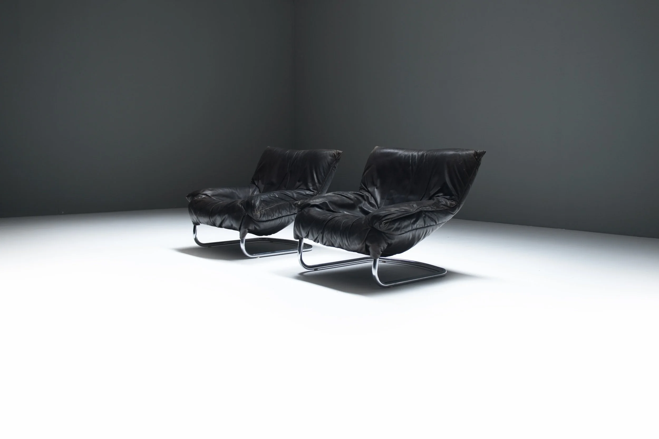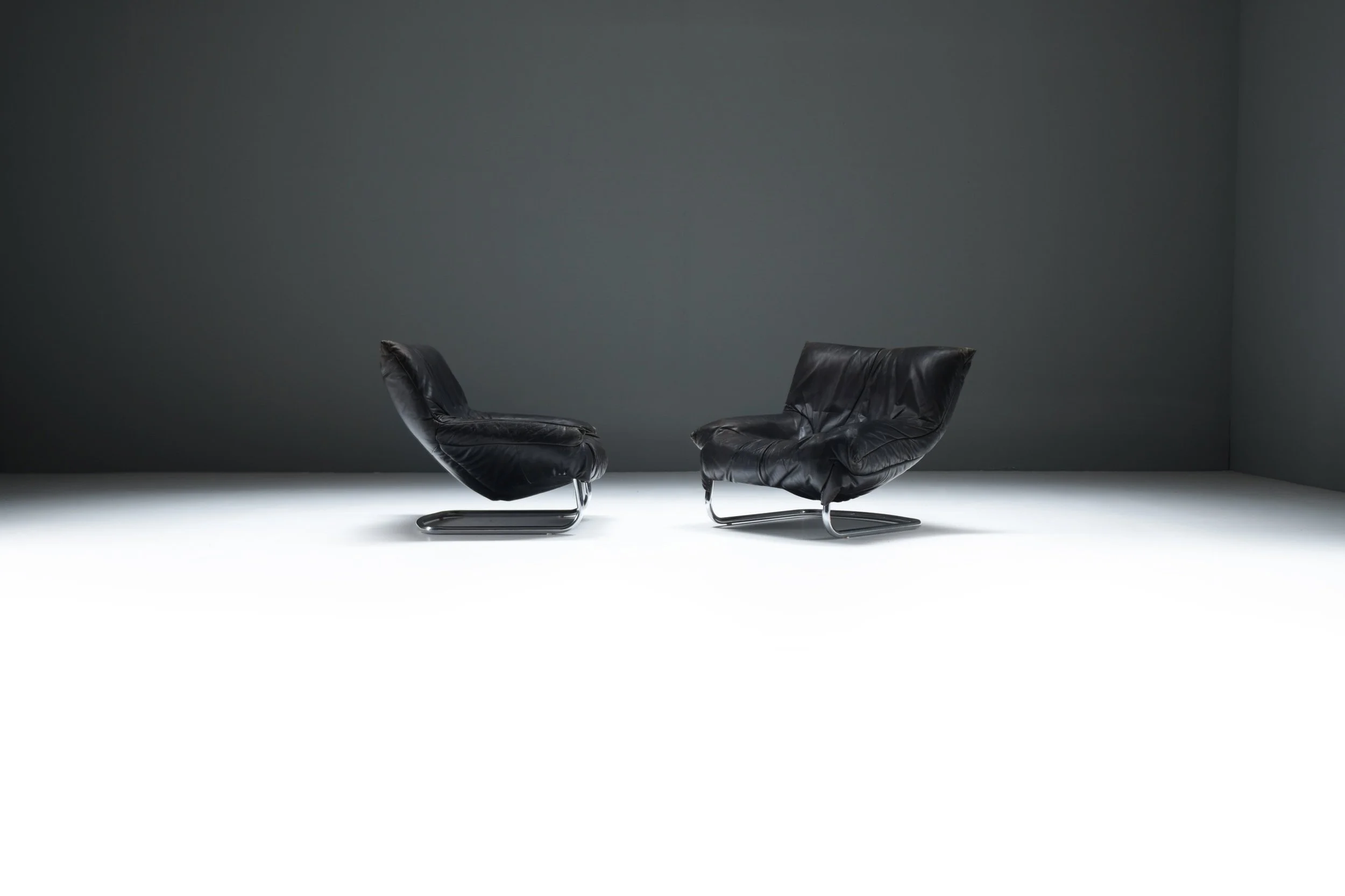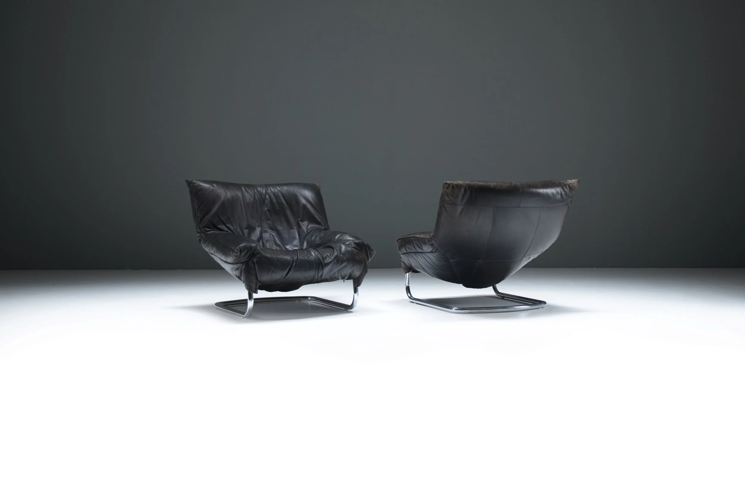 Crafted in the 1970s with hand-stitched black leather and a chromed steel cantilever sled, the chairs combine a raw masculine presence with an ease that invites lounging for hours. Their strong proportions and deep seating depth emphasize both attitude and comfort.
